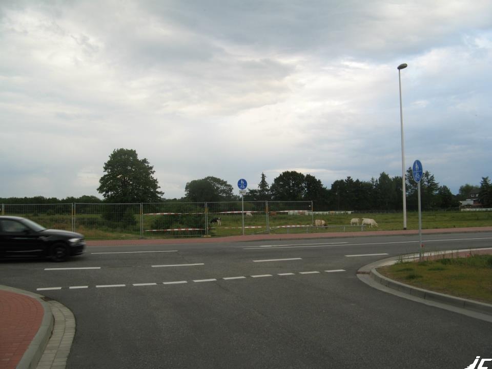 Von der Einmündung An der Dorbek aus ist ein Auffahren auf den gegenüberliegenden kombinierten Geh- und Radweg über eine Absenkung möglich. Allerdings ist der Sonderweg nicht sonderlich breit, so daß ein geschicktes Manövrieren nötig ist. Wieder soll mit einem Pfeil das lästige und gefährliche Geisterradeln unterbunden werden.