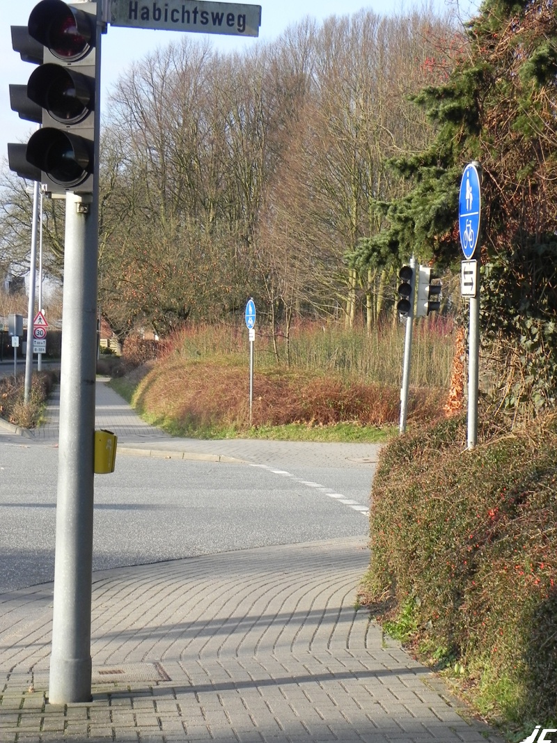 Ampelmast mitten auf dem benutzungspflichtigen gemeinsamen Zweirichtungs(!)Geh- und Radweg und im Kreuzungsbereich zurückgestetze Radwegsfurt, die vom abbiegenden KFZ-Verkehr kaum eingesehen werden kann. Selbst ohne abbiegende Autos und Fußgänger kommen hier zwei sich entgegenkommende Radler nicht gefährdungsfrei aneinander vorbei.