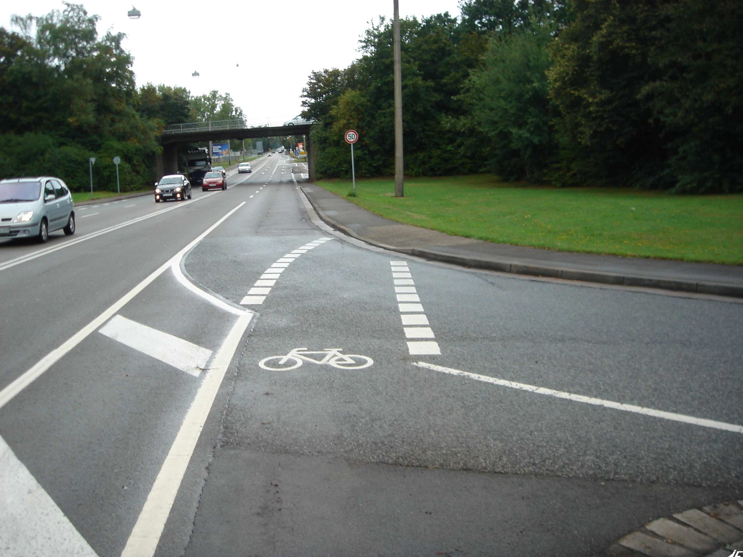 Die nächste Furt. Diesmal eindeutig beschildert, der Verkehr auf der einmündenden Überleitung von der B270 muss dem Radverkehr Vorfahrt gewähren (das entsprechende Zeichen 205 ist allerdings nicht mit auf dem Bild). Man tut als Radfahrer aber äußerst gut daran, sich nicht auf sein Vorfahrtsrecht zu verlassen. Am Ende der Furt freut sich manch ein Radler darüber, dass hier kein Zeichen 240 steht, er darf also die Fahrbahn benutzen. Ob er nach vorsichtigem Überwinden des spitzwinklig zu überfahrenden teilabgesenkten Bordsteins auch den Gehweg befahren dürfte ist fraglich, einziges Indiz hierfür wäre die auf den Weg führende Furt, die den Weg möglicherweise zu einem "anderen Radweg" machen könnte.