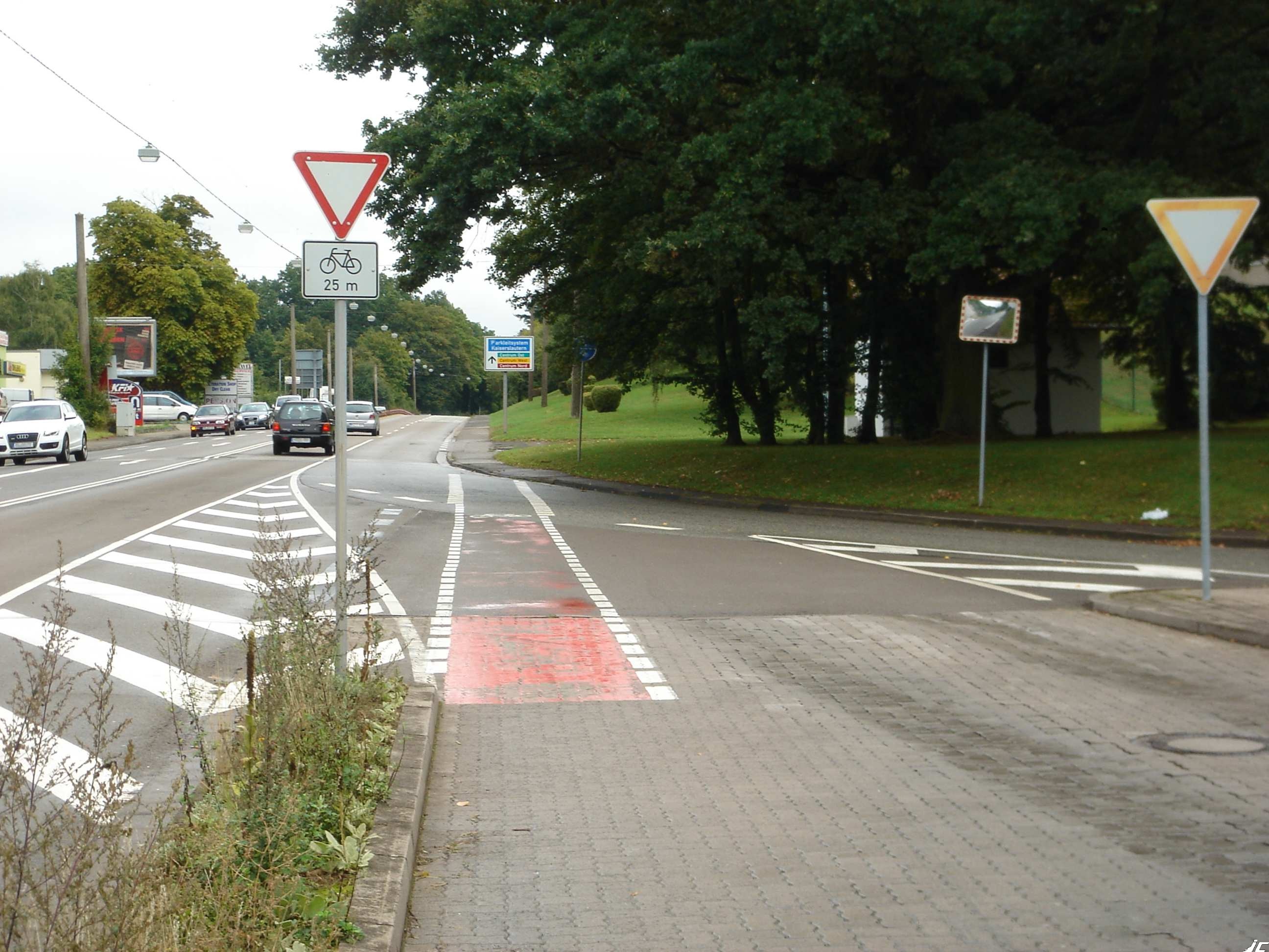 ... und vermeiden so, uns mit dieser Situation am Ende der Bushaltestelle konfrontiert zu sehen. Das rechte Zeichen 205 ist nicht zu beanstanden. Das linke dagegen schon. Gilt es ebenso wie das rechte für Fahrzeuge, die aus der Bushaltestelle ausfahren oder gilt es für Fahrzeuge auf der geradeaus verlaufenden Fahrbahn? Und was hat es mit dem Zusatzzeichen mit dem Fahrradpiktogramm auf sich? Da in der StVO nicht vorgesehen ist, ein Zeichen 205 mittels Zusatzzeichen nur auf bestimmte Fahrzeugarten zu beschränken kann es sich nicht explizit nur auf Radfahrer beziehen. Also bezieht es sich auf den Geradeausverkehr und signalisiert ihm, dass er in 25 Metern die Vorfahrt von Radfahrern beachten muss? Und dann ist da letztlich auch noch die Furt die dort nicht sein darf, wo der Radverkehr keine Vorfahrt hat. Kurzum - Rätsel über Rätsel, und im Falle eines Unfalls sind alle Unfallbeteiligten die Dummen.