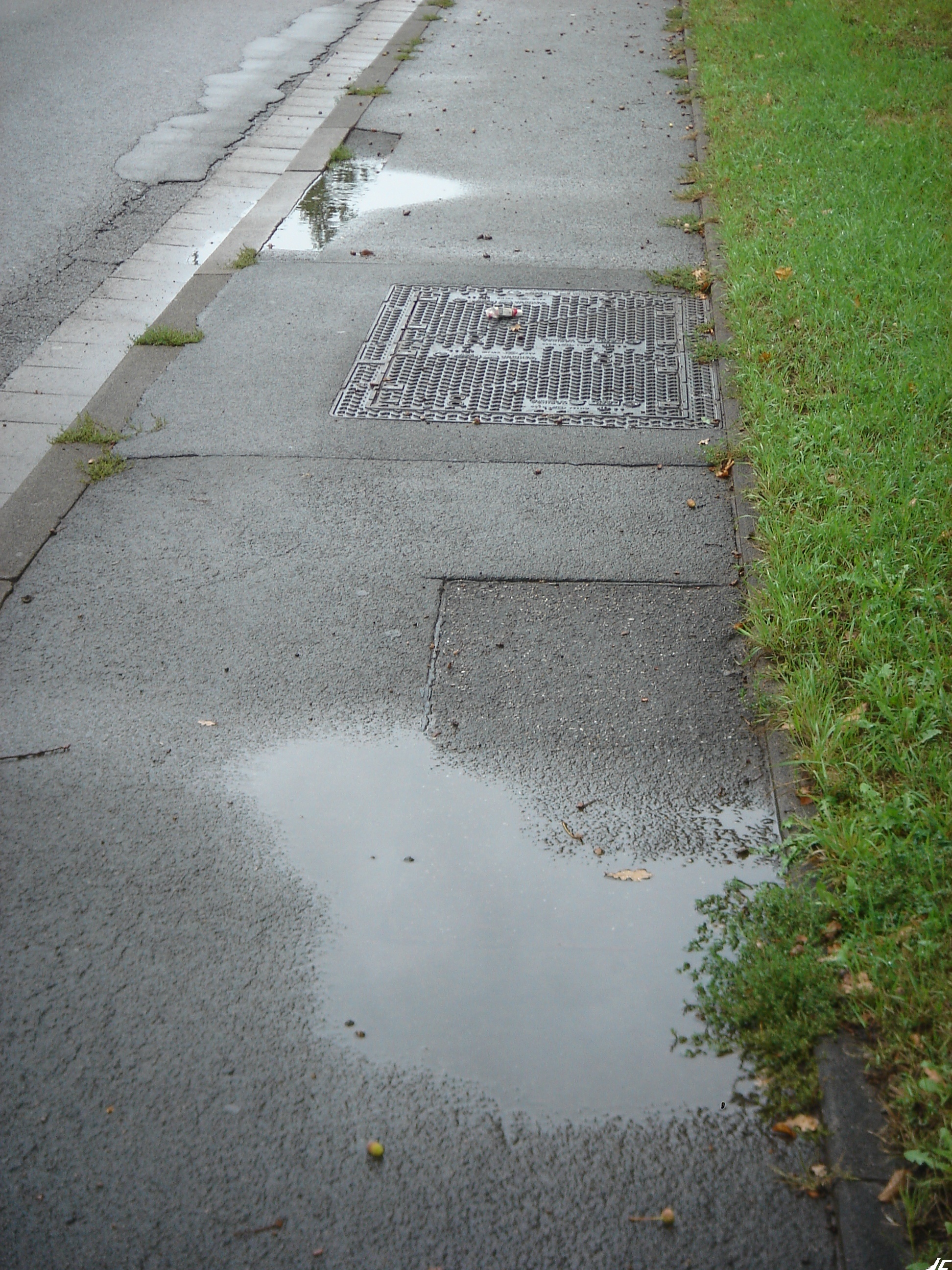 Die Oberfläche des gemeinsame Geh- und Radwegs wird zusehends schlechter. Holprige Flickstellen und bei Nässe gefährlich rutschige Serviceschächte, nach wie vor knapp 1,50 Meter Breite. Wie sollen hier Radfahrer und Fußgänger gefahrlos aneinander vorbeikommen?