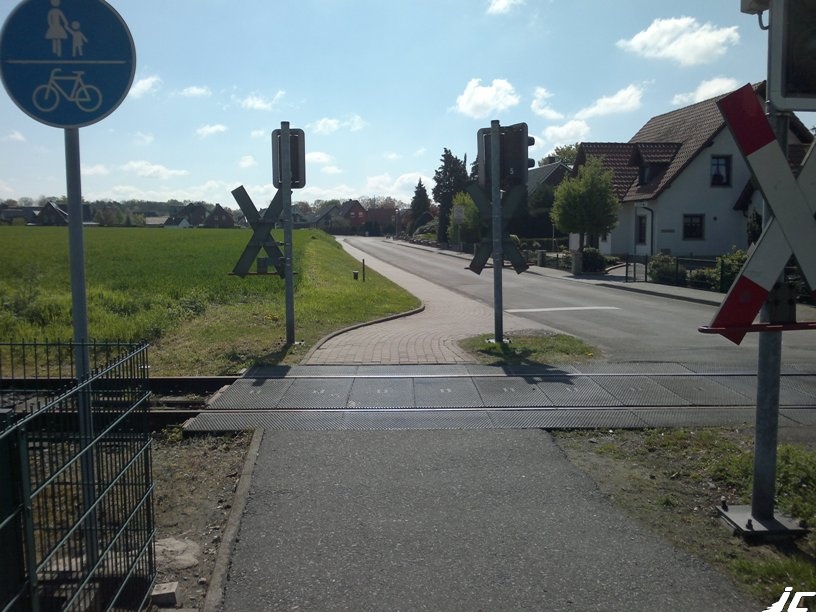 Um links weiter in die Haarstraße und damit in die Siedlung zu fahren, bedarf es einer erneuten Überquerung der Straße in Kreuzungsbereich, denn leider ist dieser linksseitige Radweg benutzungspflichtig in beide Fahrtrichtung. LKW dürfen hier nicht in die Haarstraße einfahren. Der einzige Verkehr besteht also aus den paar Anwohnern. Was war gleich noch das Brandgefährliche an dieser Fahrbahn? Auf dem Foto ganz schwer zu erkennen ist rechts das Tempo30-Zonen-Schild. Es gibt also für die Straßenverkehrsbehörde keinen Ermessensspielraum mit der Radwegbenutzungspflicht, denn in Tempo30-Zonen darf eine solche nicht angeordnet werden.