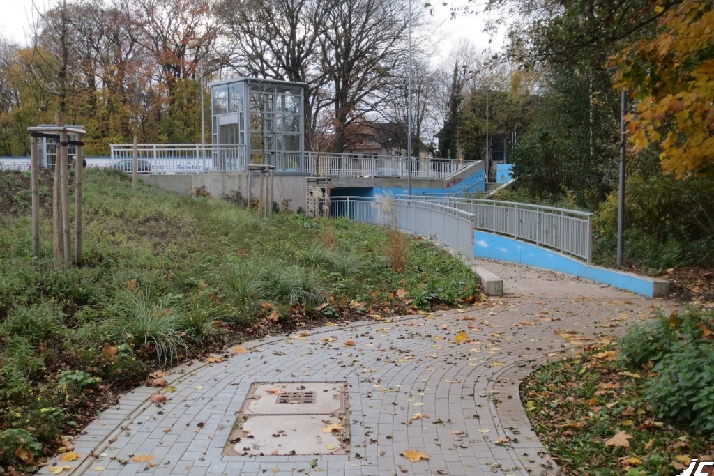 Hat man sich nicht für den Weg in nördlicher Richtung über die Ampel, sondern für den über den Zebrastreifen in westlicher Richtung entschieden so gelangt man zu der hier gezeigten Rampe mit engen und unübersichtlichen Verschwenkungen. Möglicherweise wundert man sich über den ominösen Glaskasten...