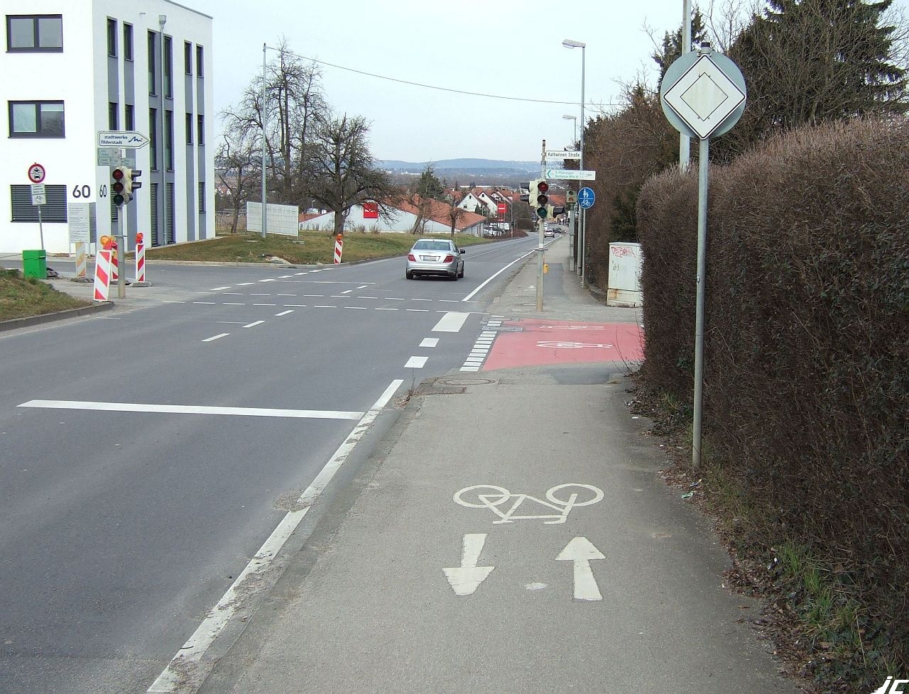 Doch noch aus einem anderen Grund ist es sicherer, langsam zu tun. In Filderstadt stehen nämlich selbst auf abschüssigen, benutzungspflichtigen Zwei-Richtungs-Rad- und Fußwegen Ampelmasten quasi mittig. Also: Radfahrer und Fußgänger von vorne und hinten, Autofahrer von Rechts (und von links mitunter auch), Radfahrer und Fußgänger aus der Ampelfurt ebenfalls von links, von rechts aus dem Gehweg, Radfahrer, die an der Ampel warten (da ist so ein Radfahrerhaltebügel, also warten die auch da).... ein Unding! Man denke hier auch an ortsunkundige Radfahrer bei Dunkelheit, Nässe, Schnee usw.!