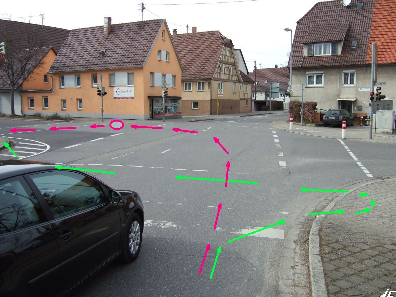 Aus südlicher Richtung (Sielminger Hauptstraße) ist das Problem ähnlich: Wie erreicht der Radfahrer, der nach links will, den dort linksseitigen, benutzungspflichtigen Radweg ohne von Kfz in die Zange genommen zu werden. Vielleicht so wie die Pfeile es zeigen?