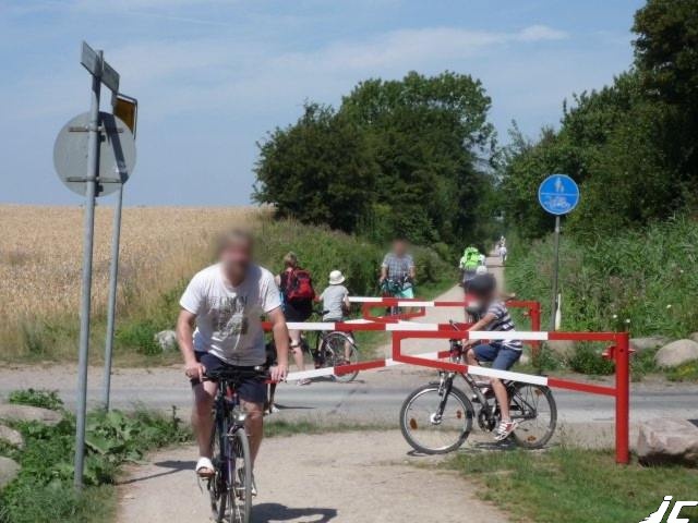 Die nächste Querung, die Königsberger Straße. Wie schon im vorangegangenen Bild eine reine Anliegerstraße mit äußerst geringem Verkehrsaufkommen. Ohne die Umlaufsperren wäre hier eine übersichtliche Situation gegeben und eine Querung gefahrlos möglich. Stattdessen muss man aber aufpassen, das man sich beim Passieren der Gitter mit den anderen Radfahrern arrangiert