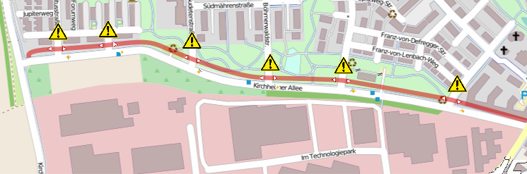 Galerie Startseite » Pannenflicken 2015 » 13. Platz - Poing » KirchheimerAlleeUeberblick [Slideshow bei deaktiviertem JacaScript nicht nutzbar] Weiter Bild 2 von 3 926 926 929 929 KirchheimerAlleeUeberblick Bild-Informationen Beschreibung Kartenausschnitt mit dem fraglichen Weg. Benutzungspflicht in beiden Richtungen trotz 6 (!) Einmündungen auf knapp einem Kilometer.