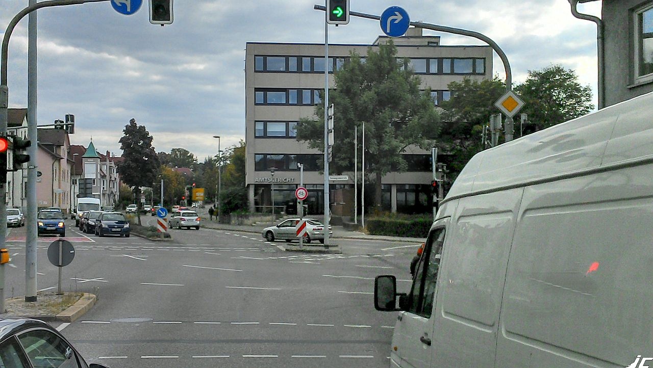 Steht man als Ortsunkundiger hier an der Ampel, hat man gut erkennbar "ein Problem". Denn der Gehweg ist rechts wie links nicht für Radfahrer freigegeben (siehe voriges Bild). Warum Radfahrer mittlerweile dennoch gehäuft dort fahren, lässt sich nur spekulieren.