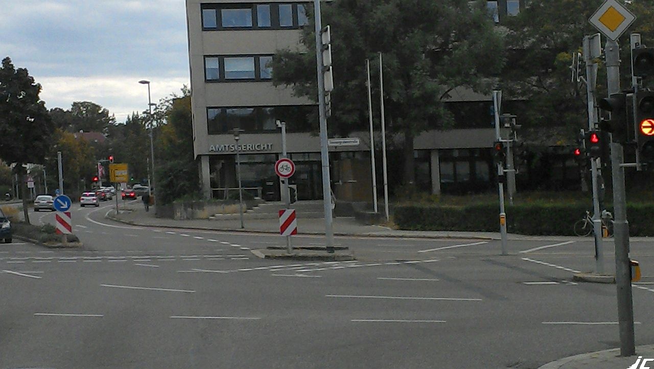 Das "da hinten", unmittelbar vor dem Zeichen 254 (Verbot für Radfahrer) ein paar Linien nach rechts weggehen, kann keiner ahnen. Schon gar nicht nachts und bei Nässe. Und der Vollständigkeit halber: Nicht jeder ist so groß wie der rund 2 m große Einsender dieses Bildes. Man kann also davon ausgehen, dass hier bei den meisten Radfahrern die Verwirrung komplett sein dürfte. Denn - Achtung - genau genommen darf ab diesem Schild die weiterführende Straße nicht mehr mit dem Rad befahren werden sondern es besteht Gehweg-Schiebezwang, wenn man hier weitermöchte. Das ist nicht spitzfindig sondern z.B. im Falle eines Unfalls ein gefundenes Fressen für gewiefte Rechtsanwälte.