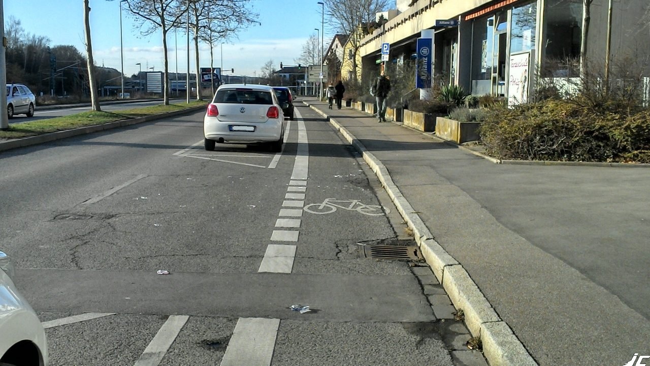 Wieder ein Gullydeckel, stark beschädigte Fahrbahnoberfläche am Radfahrstreifen, Unrat.... - gerade an der Beifahrertür unversehrt vorbei, denkt man, auf was muss man noch alles aufpassen auf diesem "sicheren Radfahrstreifen". Da vorne glitzert etwas...Scherben. Das ist genug. Der Einsender bremste bis zum Stillstand ab, verließ den Radfahrstreifen und zückte die Kamera für diese Bilder.