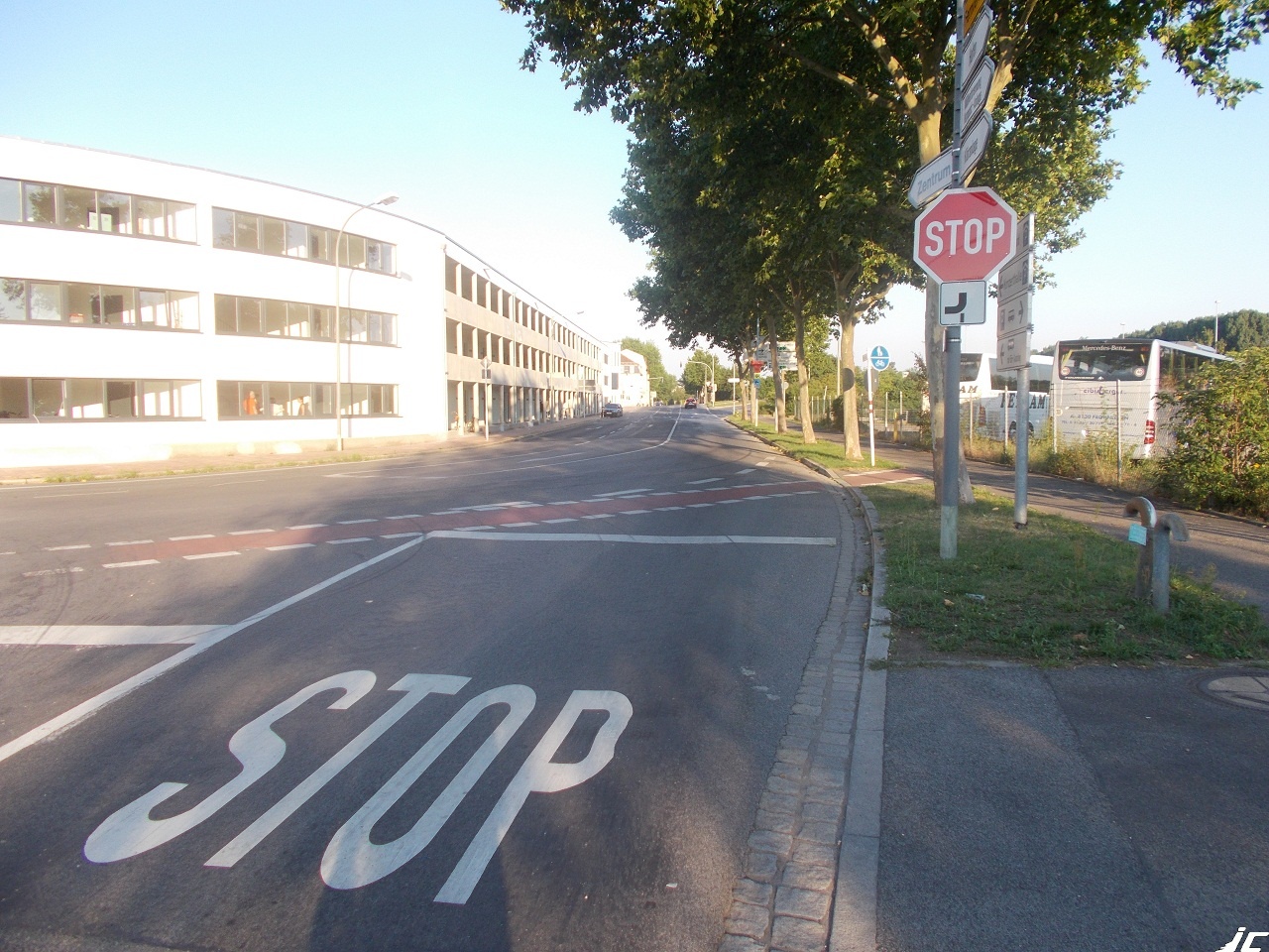 Bis zur Einmündung der Lichtenhaidestraße verfügt der Margaretendamm über keinerlei Radverkehrsanlagen. Die der abknickenden Vorfahrt folgende, rot markierte Furt stellt die Fortsetzung eines mit Fahrradpiktogrammen versehenen, ohne Sicherheitsabstand entlang angeordneter Gehwegstellplätze verlaufenden Seitenstreifens (!) dar.