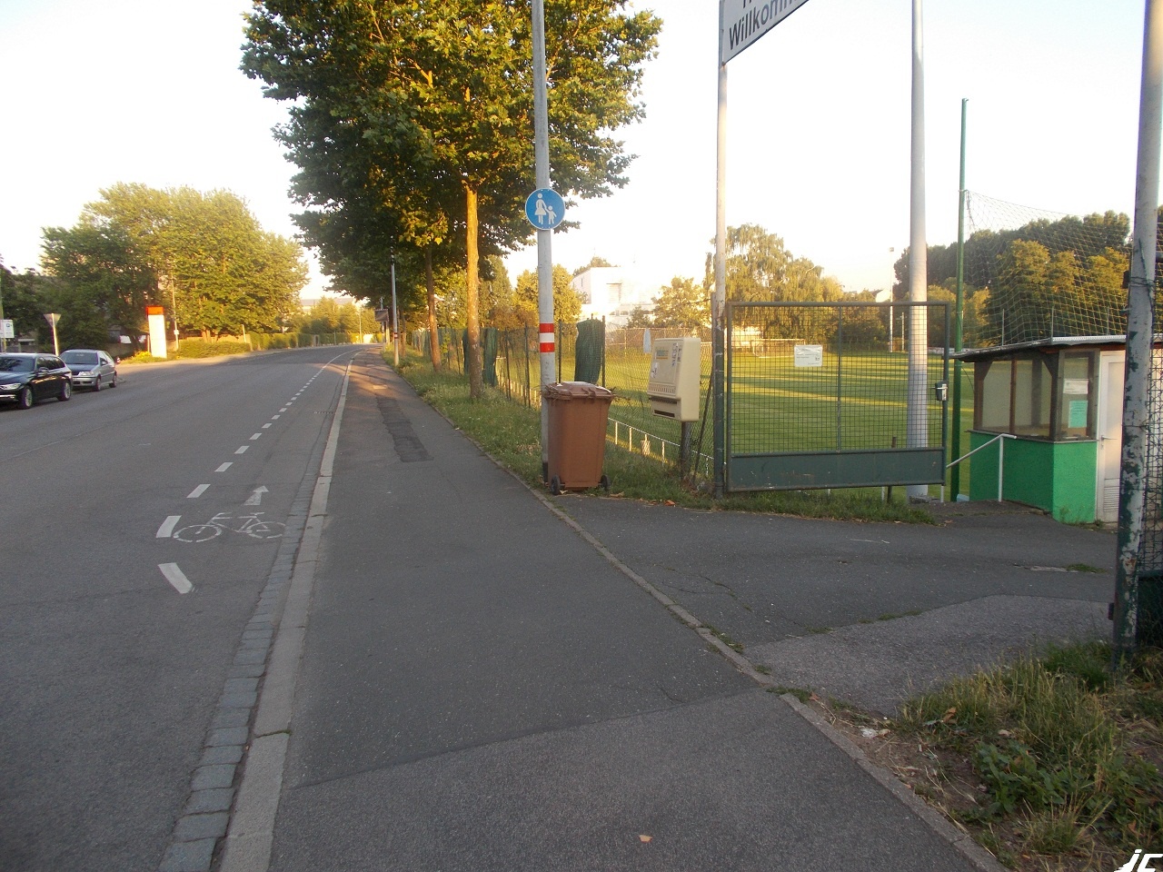 Wenige Meter nach dieser Fahrbahnverengung wird der Radverkehr genau in der Grundstückszufahrt eines Sportgeländes auf einen sogenannten Schutzstreifen auf der Fahrbahn geleitet. Ein großer Teil der Kraftfahrer nimmt den Beginn des Schutzstreifens kaum wahr, die Radler müssen zusätzlich auf die Grundstückszufahrt und die unzureichend abgesenkte, bis zu 3 cm hohe Bordsteinkante achten.