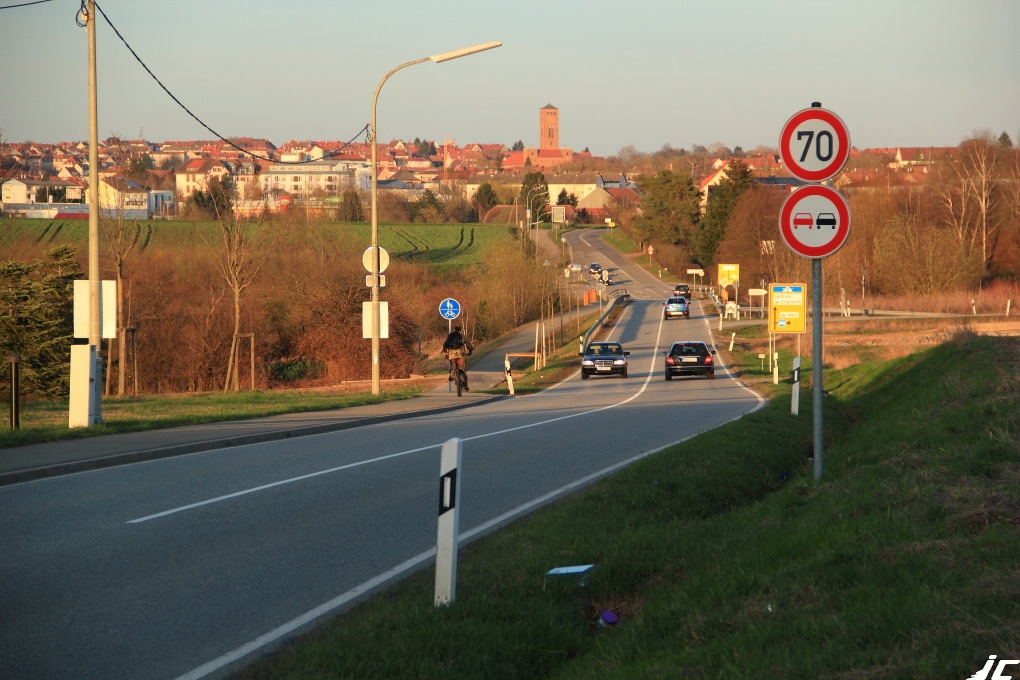 Zuerst ein Blick von West nach Ost bzw. Winzeln nach Pirmasens. Man erkennt: Tempo 70, Überholverbot, übersichtliche, gradlinige Fahrbahn, rechts eine Einmündung. Man erkennt auch links den alten, schmalen Bürgersteig und das nun plötzlich, mitten in der "Prärie" auftauchende Zeichen 240 (benutzungspflichtiger Rad- und Fußweg = Fahrbahnverbot). Sogar ein seltener Radfahrer (der verbotenerweise schon bei der Anfahrt den Gehweg nutzte) ist zu sehen. Der Weg endet hinten am Knick nach rechts an der Kuppe. Es geht also um ein paar 100 Meter.