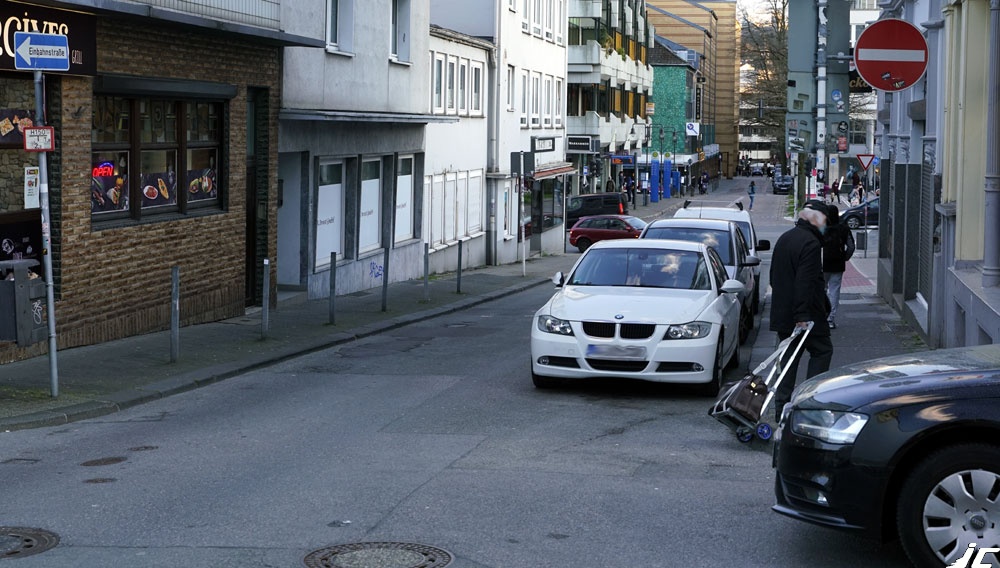 Beginnen wir die Fahrt im bereits fertiggestellten Teil an der Friedrichstraße in Elberfeld in Höhe der Einbahn Albrechtstraße südwärts. Bisher reicht es nicht einmal für eine Radverkehrsfreigabe in Gegenrichtung (das Zeichen 267 = Verbot der Einfahrt).