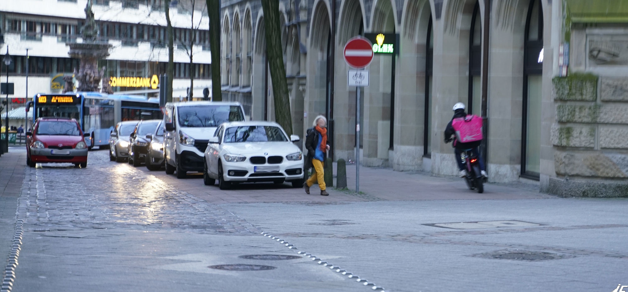 Bleibt also für uns noch die Möglichkeit, entweder am Karlsplatz vor dem Ende des Radwegs auf Fahrzeuge zu warten, oder etwa 100 Meter weiter an der nächsten Querstraße (Willy-Brandt-Platz/Durchgang Rommelspütt). Oder wir fahren nach dem Motto: „Wer sein Leben liebt, liebt Gehwege“ über denselbigen. Einer von vielen Gründen, warum Radfahrer sich oft unbeliebt machen – sie handeln oft aus purer Not und Lebenserhaltungstrieb.