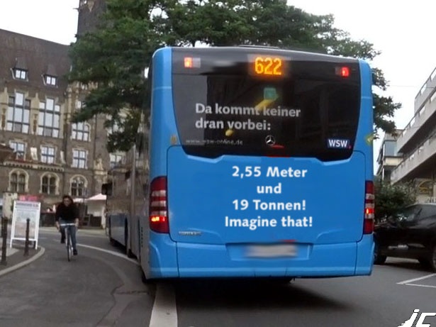 Auch hier: Der Aufkleber 2,55 m 19 Tonnen imagine that wurde vom Einsender per Bildbearbeitung "platziert", der von einem dieser Busse in der Schleppkurve beinahe eingeklemmt wurde, wäre er nicht instinktiv auf den Gehweg (!) geflüchtet.
