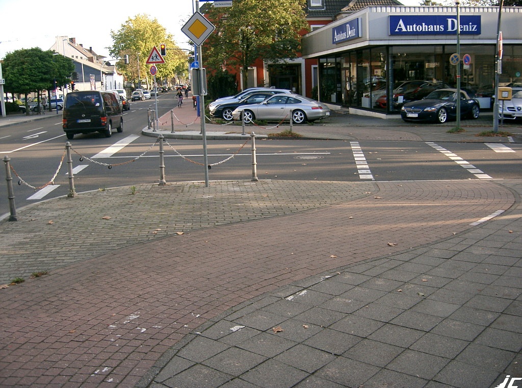 Wehe dem Radfahrer, der hier bei Dunkelheit geradeaus fährt und die unsinnige Kettenabsperrung "trifft". Erkennt er die Verschwenkung und folgt ihr, so kann er rätseln, ob er Vorrang vor dem Verkehr auf der Fahrbahn hat oder nicht. Führungen wie diese bergen ein immenses Risiko und führen immer wieder zu schweren und teilweise tödlichen Unfällen. Nicht umsonst wird in den einschlägigen Regelwerken (z. B. ERA 2010) empfohlen, statt solcher Verschwenkungen den Radverkehr rechtzeitig vor der Einmündung auf die Fahrbahn zurückzuführen, damit sich der Radfahrer im Sichtbereich des Verkehrs auf der Fahrbahn befindet.