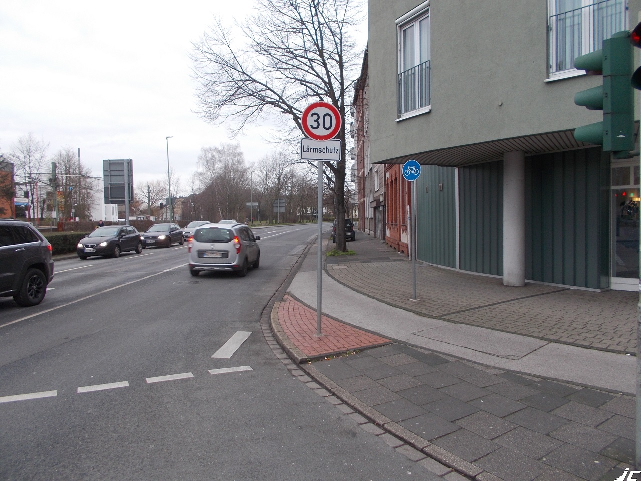 Für die Kremerstraße hingegen, nahe des Stadtzentrums, gilt dies keineswegs. Der Radweg hat kaum Lenkerbreite, rechtsseitig wird ohne Sicherheitsabstand und markiertem Sicherheitsstreifen auf dem Gehweg geparkt (erkennbar auch auf Google-Maps), auf der recht breiten Fahrbahn sind maximal 30 km/h zulässig. Doch man darf hier von Amts wegen nicht mit dem Rad fahren. Das macht sprachlos.