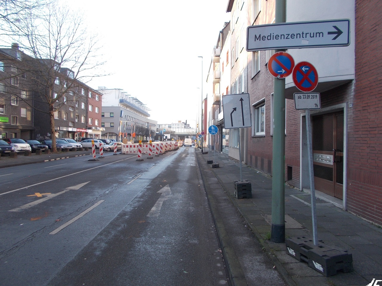 Galerie Startseite » Pannenflicken 19/20 » Baustellenchaos Sonderpreis - Baustelle Duisburg » Bild 5 - Fahrtrichtung West - Baustellenbeginn 1284 1284 1285 1285 1286 1286 1287 1287 [Slideshow bei deaktiviertem JacaScript nicht nutzbar] Zurück Bild 4 von 7 Weiter Bild 6 von 7 1289 1289 1290 1290 Bild 5 - Fahrtrichtung West - Baustellenbeginn Bild-Informationen Beschreibung In Gegenrichtung erfolgt die Anordnung des gemeinsamen Geh- und Radwegs mit Baustellenbeginn, gleichfalls ohne Bordsteinanpassung und ohne Berücksichtigung der stark beengten Verhältnisse. Wie kommen Radfahrer hier sturzfrei auf den Bordsteinweg?