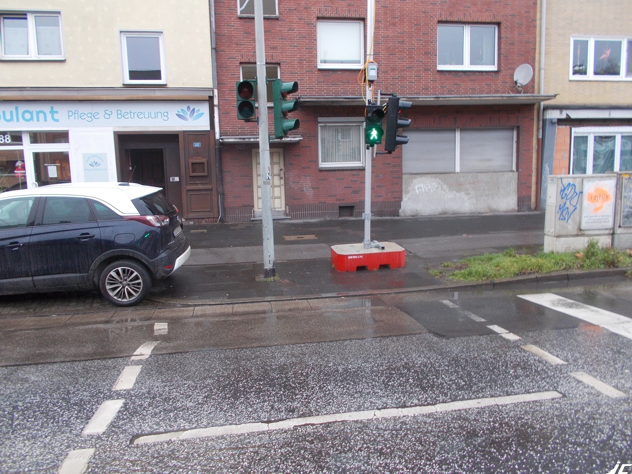 Auf der gegenüberliegenden Straßenseite wurde zwar nicht der Radweg blockiert. Doch die Positionierung der Hilfssignalanlage stellt Rollstuhlfahrer/innen, Menschen mit breiten Kinderwagen und ihr Gefährt schiebende Radler/innen vor vermeidbare Probleme.