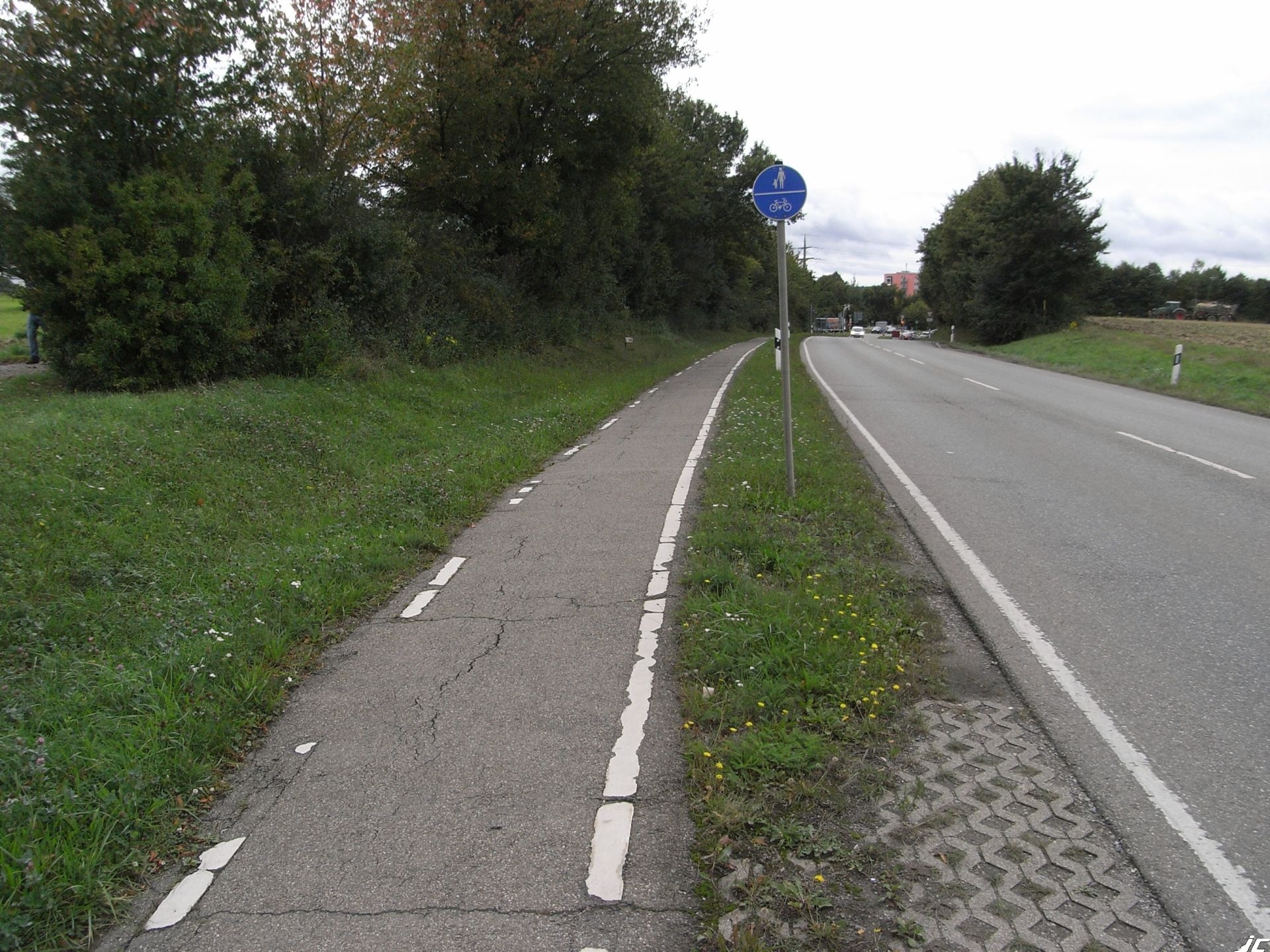 Kaum mehr als 1 Meter breiter abschüssiger Radweg bei Filderstadt ("Fahrradfreundliche Kommune"). Seit mehr als 30 Jahren Fahrbahnverbot für Radfahrer aller Art, die hier kaum aneinander vorbeikommen, ohne sich zu verhaken (aktuelle MTB-Lenker sind ca. 80 cm breit).