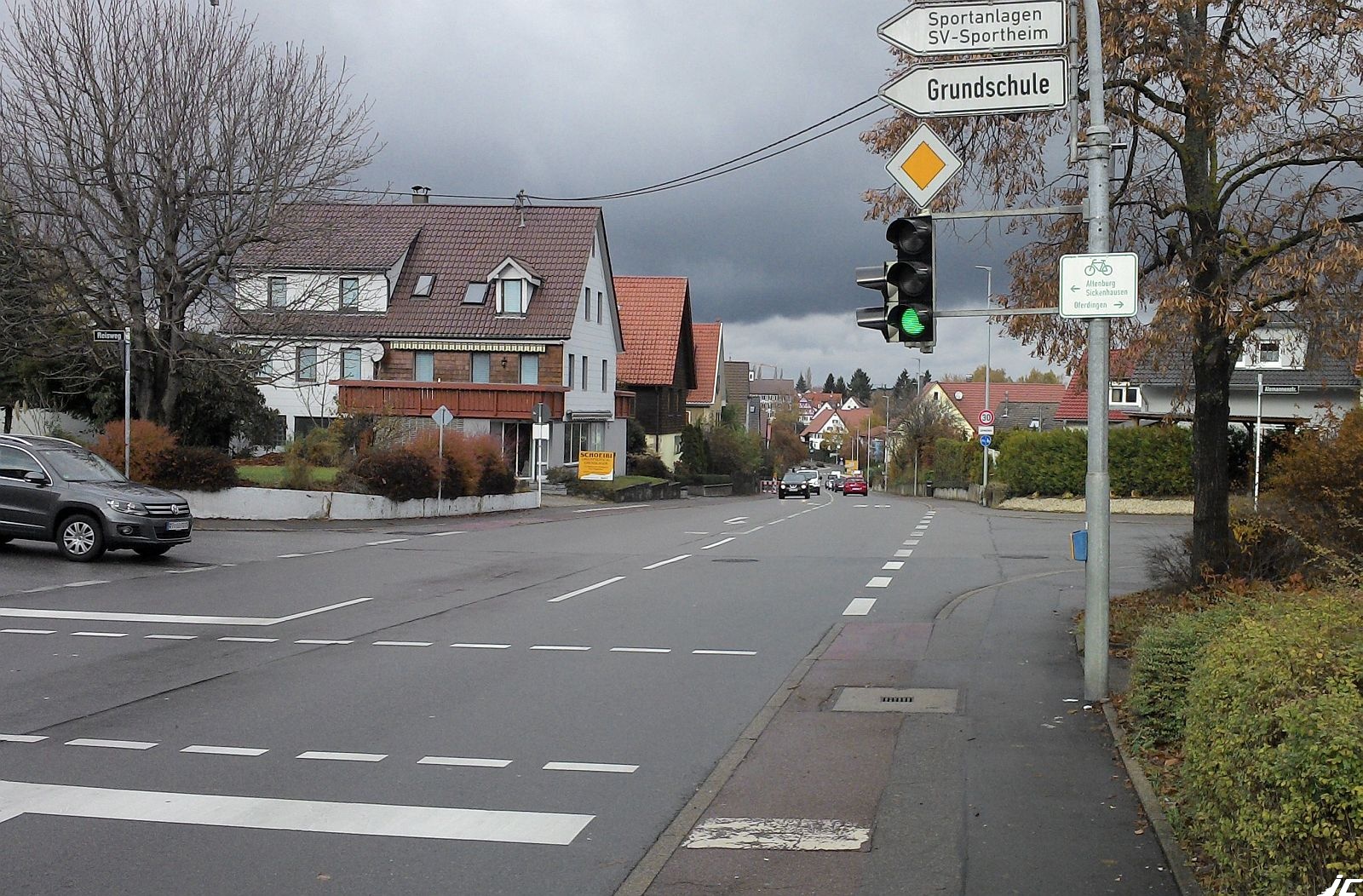 In Rommelsbach kommt man auf dem Radweg an die Alemannenstraße. Wegweiser mit winziger Schrift zeigen, wo es hingeht. Wer nach links möchte, darf sich schon mal die Frage stellen, wie er sich hier einordnen soll.