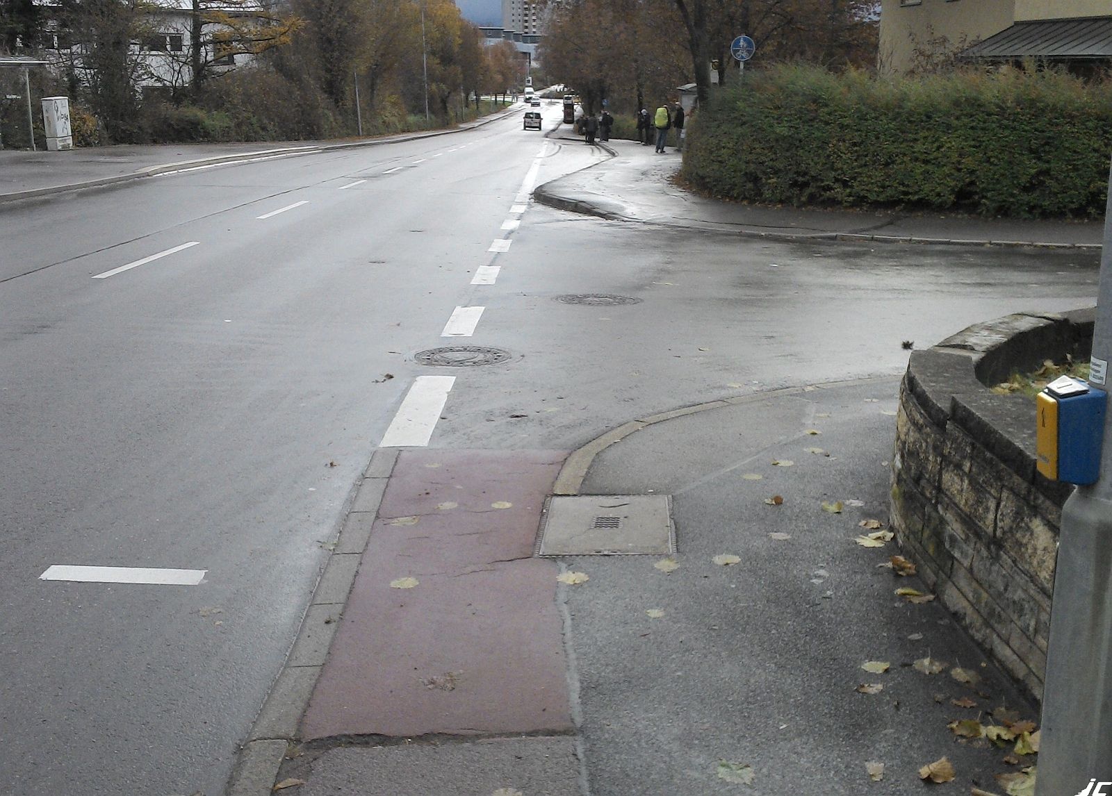 Der Radweg wird benutzungspflichtig auf dem Bordstein weitergeführt. Ein Vorbeikommen an Autos, die aus der Seitenstraße kommend am Fahrbahnrand stehen, ist kaum möglich, zumal die Bordsteinabsenkung auch noch ein gutes Stück weiter rechts ist. Dann geht es weiter durch eine regelmäßig stark frequentierte Bushaltestelle.