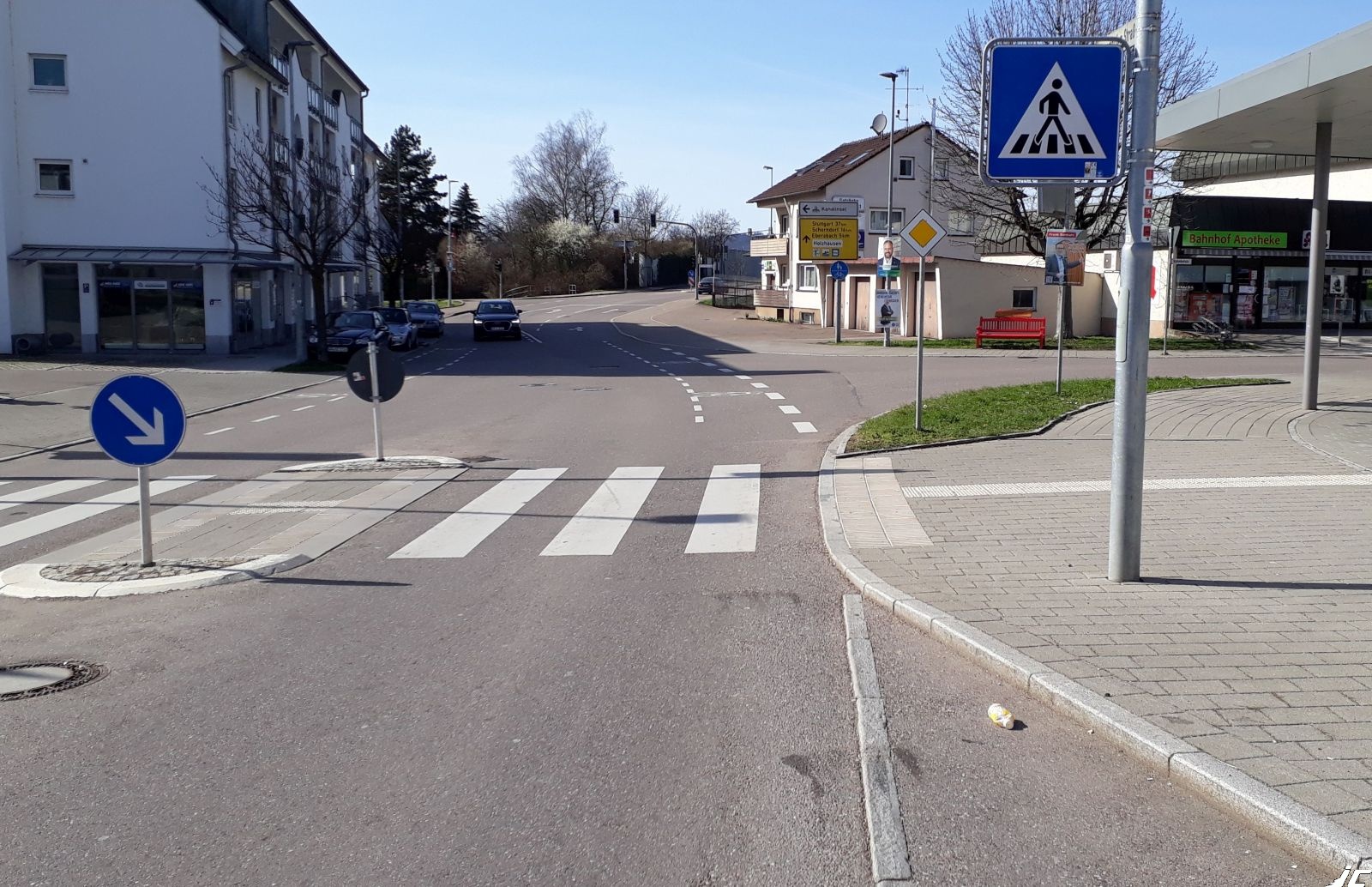 Hier nun der Blick 180° gedreht in Gegenrichtung. Bahnhofstraße nun von rechts. Wir sehen einen ordentlichen Schutzstreifen, der eigentlich ein offenes Ende in Richtung Fahrbahn hat, doch das Blauschild rechts zwingt Radfahrer auf den gemeinsamen "Geh- und Radweg", der in Gegenrichtung den freigegebenen Gehweg ab Bild 10 darstellt. Also auch hier wieder Fahrbahnverbot.