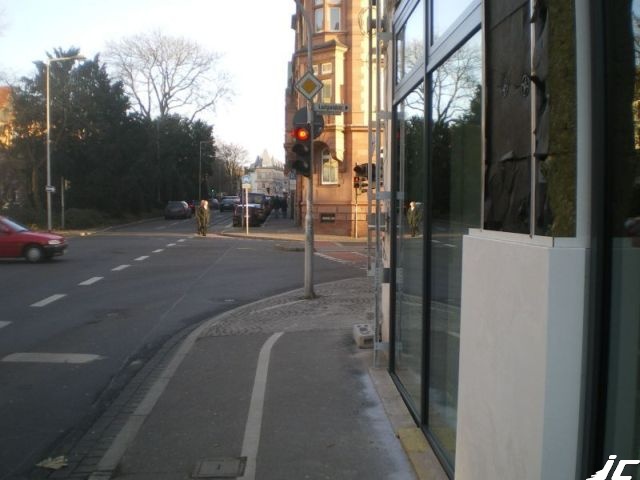 Ungenügende Breite, kein Sicherheitsraum nach links und rechts, keine deutliche Trennung zwischen Radweg und Fußweg, Belagschäden, ungenügende Sichtbeziehungen, Hindernisse, ungeeigneter Belag vor der Einmündung und eine abgesetzte Furt verdeutlichen die Tradition deutscher Ingenieurskunst im städtischen Radwegebau.