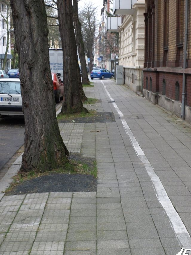 Versickerungsflächen, gebrochene Gehwegplatten, fehlende Sichtbeziehung an der Einmündung, fehlende taktile Grenze zum Fußweg, mangelnde Breite des Radweges und die fehlende Einfahrhilfe in die Fahrbahn sind völlig überflüssige Mängel eines überflüssigen und gefährlichen Radweges.
