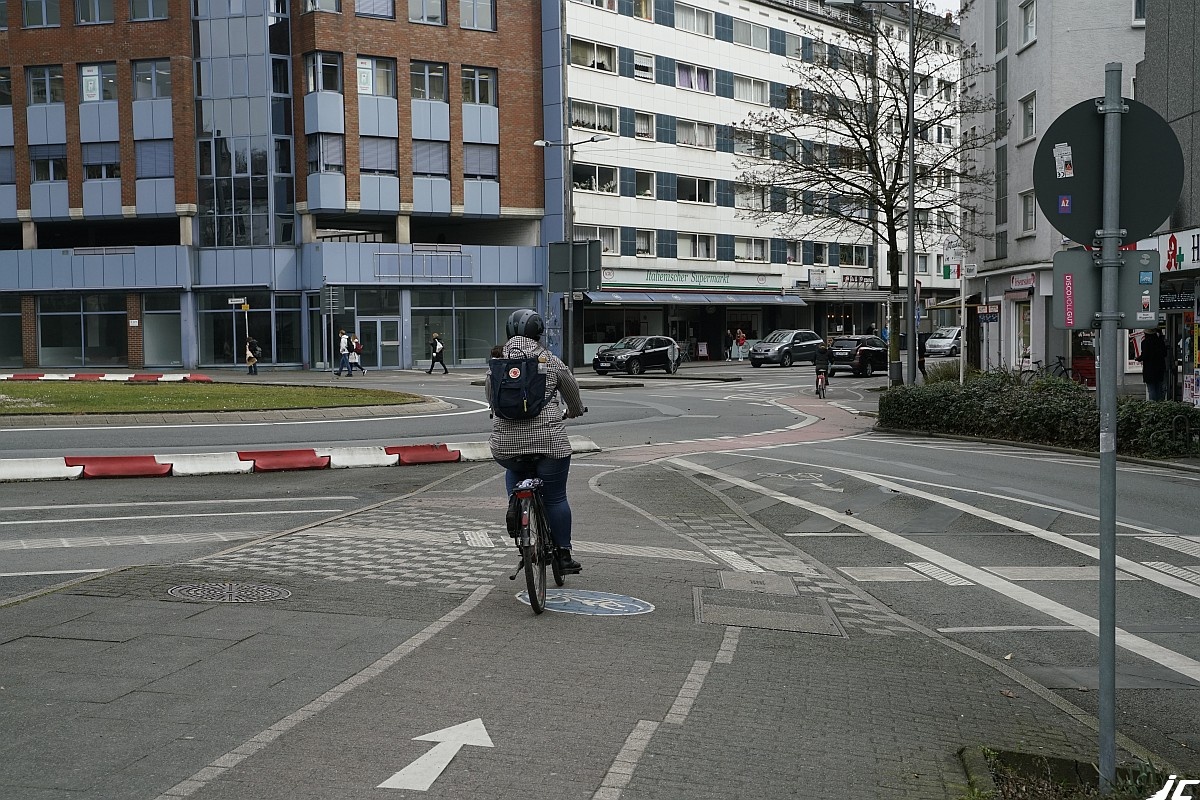 An diesem, nach Bauarbeiten 2008 entstandenen Kreisverkehr in einem „Zustand der temporären Fertigstellung“ (oder wie das amtlich heißt) wurden binnen kürzester Zeit zwei Fußgänger totgefahren. Der Hochbord-Radweg vom westlichen Hofkamp kommend verläuft illegalerweise *im* Kreisverkehr (Foto A1), sodass Autofahrer a) die ankommenden Radfahrer nicht sehen können (toter Winkel) und b) erst *auf* dem Radweg anhalten (Foto A2 - nächste Seite), weil „man ja sonst nichts sieht“.