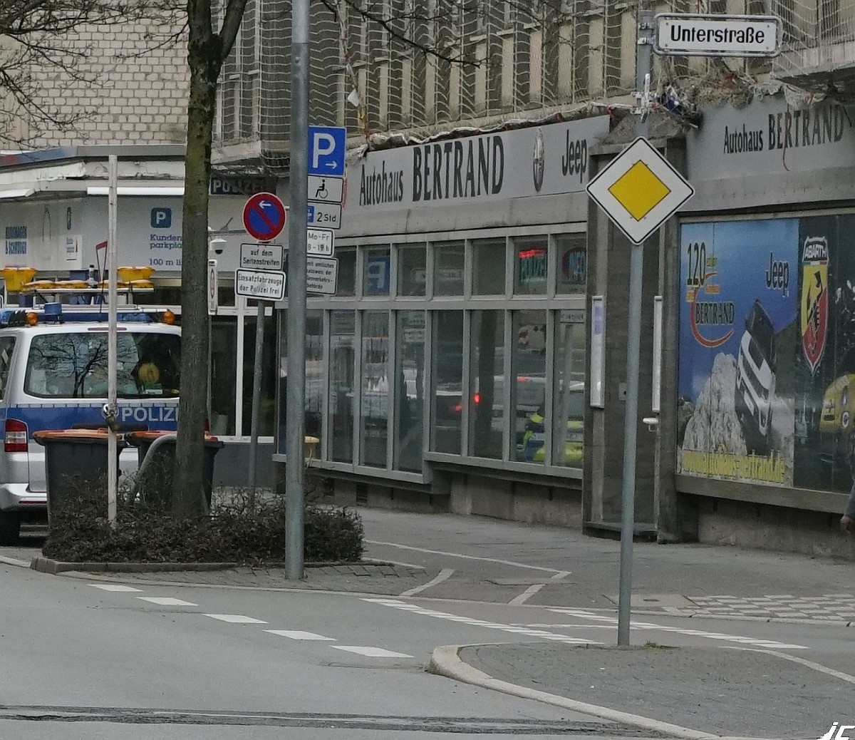 Fahren wir nun auf dem „Radweg“ nach Westen. Es hat nur 20 Jahre gedauert, dass die Stadt Wuppertal mitbekommen hat, dass man sowas nicht mehr als benutzungspflichtig ausweisen darf. Im Bereich der Polizei (Foto B1, Blick von Ost nach West) befinden wir uns nicht nur im Türbereich der parkenden Einsatzwagen, sondern haben dort großzügige 70 cm Radwegbreite zur Verfügung (sonst 100 cm).