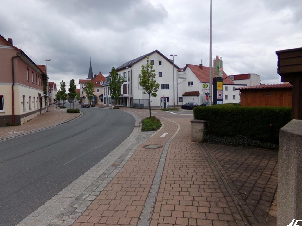 Unmittelbar vor der Zu- und Ausfahrt eines Einkaufszentrums wird der Radweg von der Fahrbahn weggeschwenkt. Es ist eine Frage der Zeit, bis der zwischen Radweg und Fahrbahn stehende Baum zu einem wirksamen Sichthindernis wird - nicht zuletzt auch für aus der Gegenrichtung einbiegende Kraftfahrzeuge. Exakt auf Höhe des Baums befindet sich rechts auf dem schmalen Gehweg die Wartefläche der Busfahrgäste an der Haltestelle.