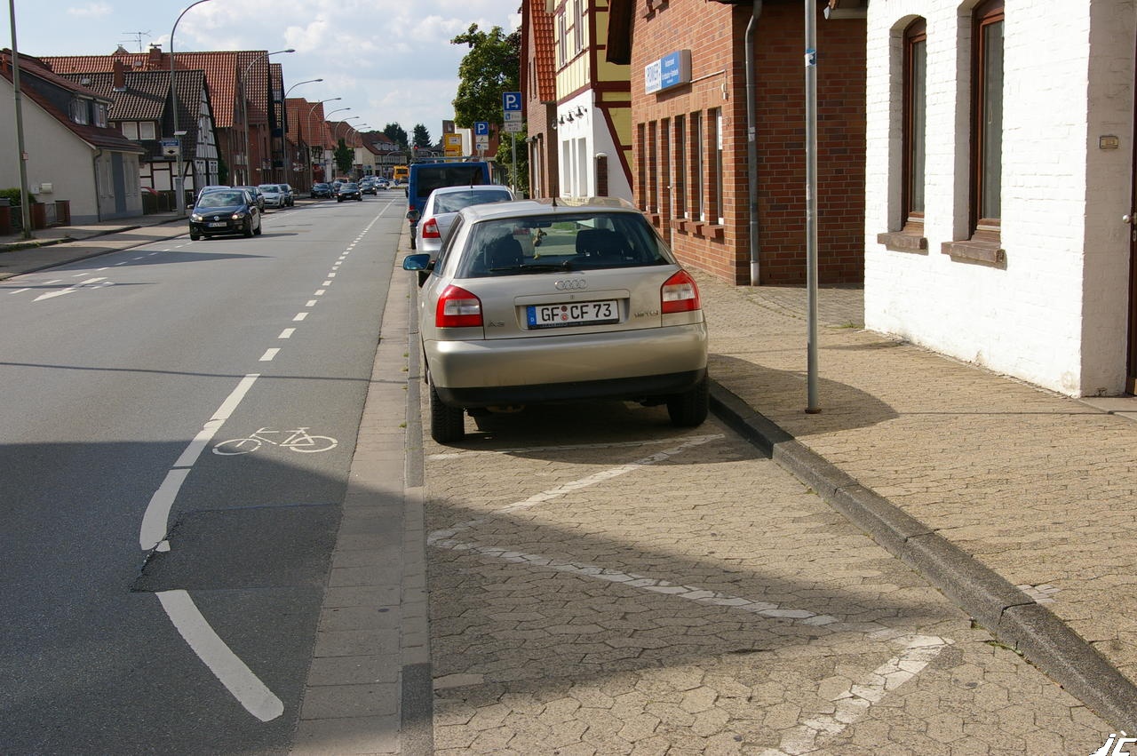 Schon nach ca. 25m hinunter auf den "Schutzstreifen", der nach weiteren 200m endet. Der "Schutzstreifen ist nur 1,30m breit. Da er direkt neben dem Parkstreifen ist, kann er fast vollständig von plötzlich geöffneten Türen blockiert werden. Hier werden Dooring-Unfälle provoziert.