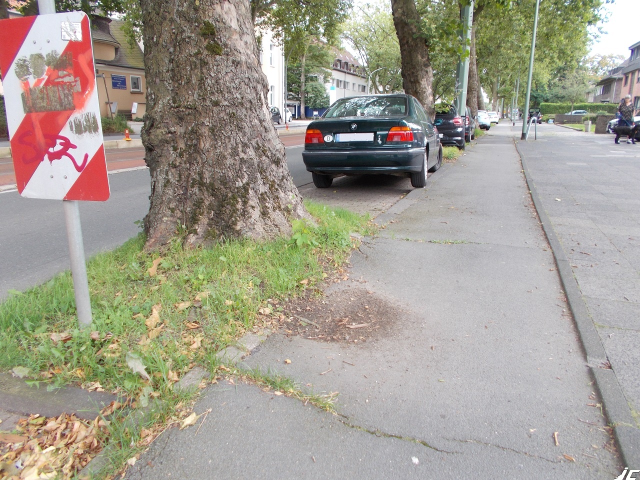 Getrennter Rad- und Fußweg, satt in der Dooring-Zone der Autos, die oft teils deutlich auf dem Radweg mitparken, zunehmend holperige Wurzelaufbrüche.