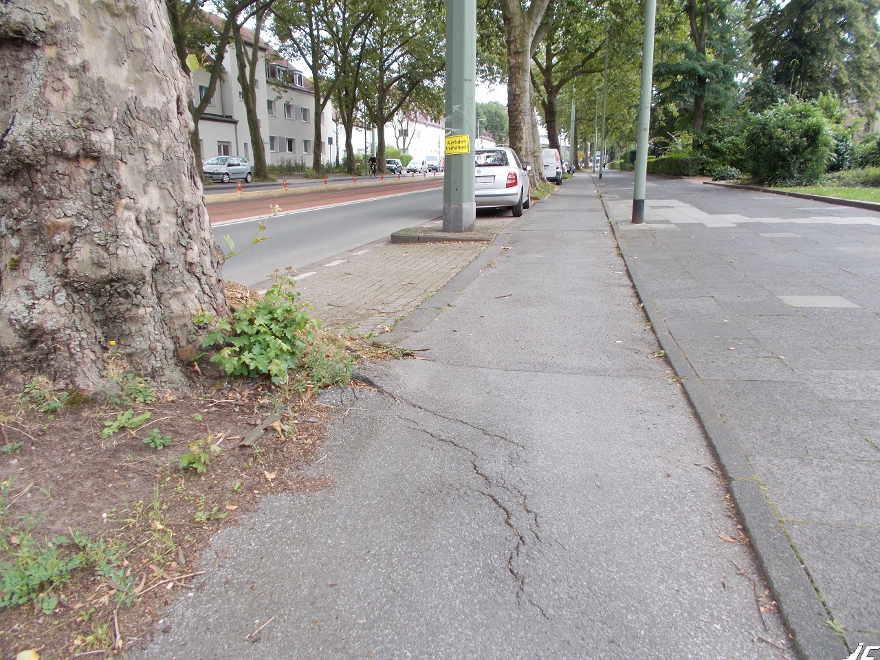 Während sich Fahrbahndecke und Parkstreifen in einwandfreiem Zustand befinden, die baumschonende Sanierung somit offensichtlich durchgeführt werden kann, ist der Radweg durch Hebungen und Aufbrüche bis zur Unbenutzbarkeit beschädigt.
