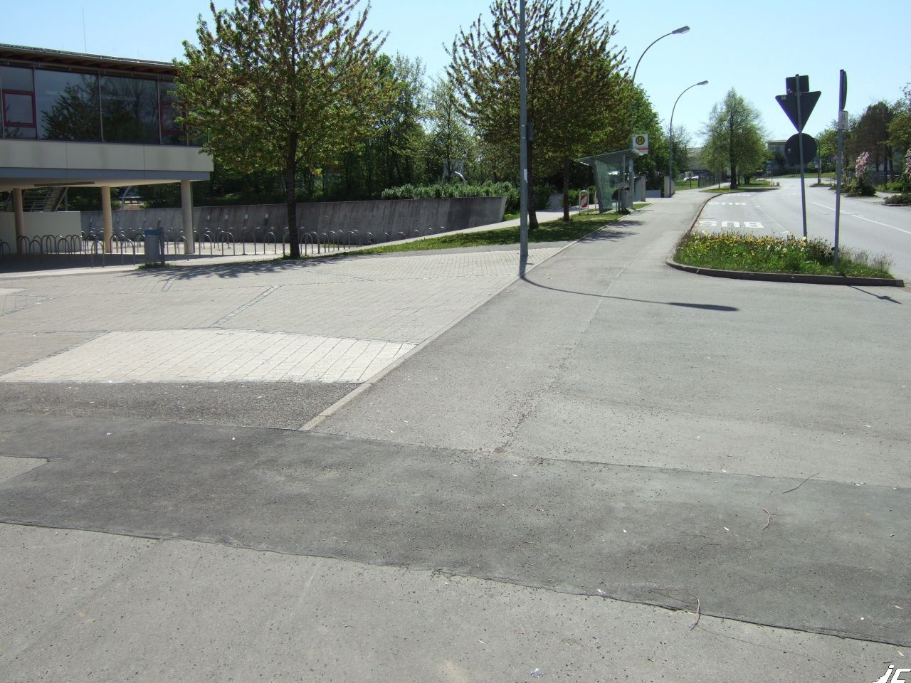 Auf dem Gelände des Gymnasiums findet man diverse verschiedene Fahrbahnbeläge, Splitt, Scherben und kann sich wohl aussuchen, auf welcher Route man gerne weiterfahren möchte. Auf dem breiten Weg linksseitig darf man es wohl nicht, so wie es aussieht. Also doch wieder zurück auf die Fahrbahn?